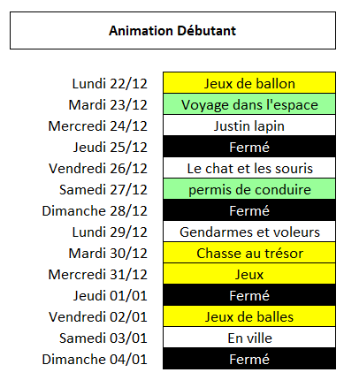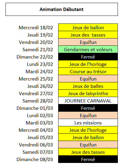 - Les Animations Débutants sont destinées aux enfants à partir de 3 ans qui découvrent l’activité. Elles sont d’une durée de 30 min pour les 3-4ans et d’une heure pour les 5 ans et plus.
