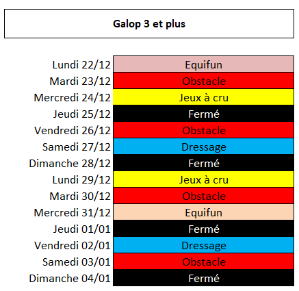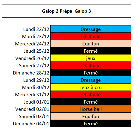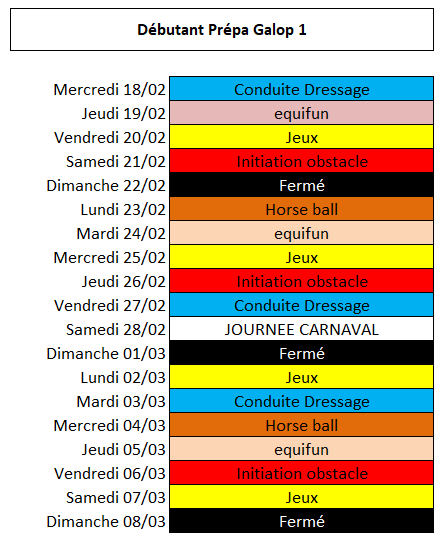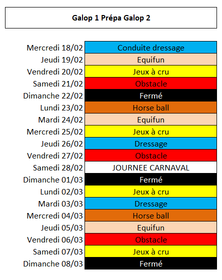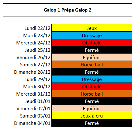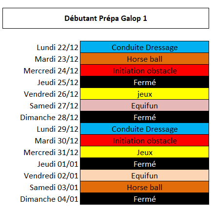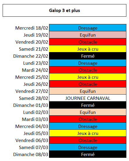 - Les animations ( de débutant à galop 3 et + ) se déroulent l’après-midi sur une durée de 2 heures qui comprennent les soins au poney et la séance à poney.